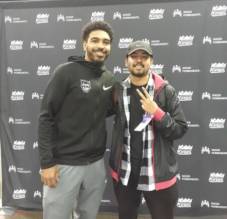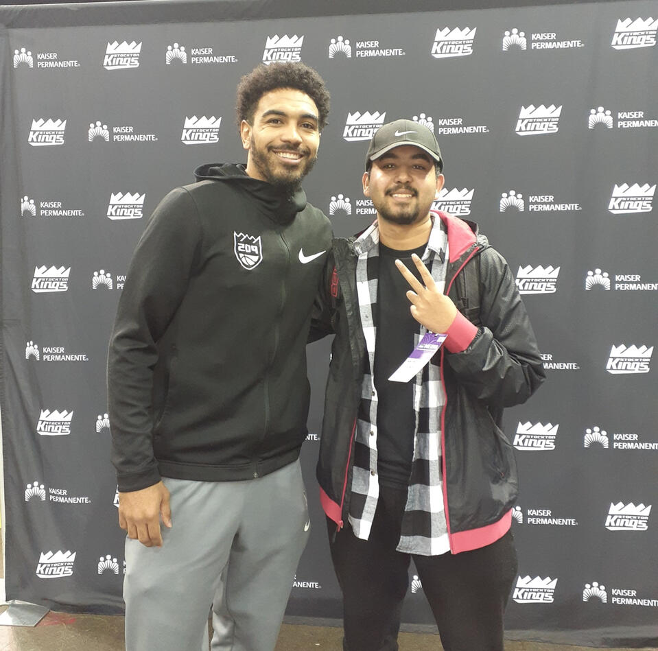 In my senior year, I reached out to the Sactown Royalty staff at SB Nation, landing a role to write game recaps. I developed by reading work from admired authors, watching the film to learn what I read and utilizing numbers to support my writing. Before the pandemic, in January 2020, I received credentials to cover my first professional game for a team: the Stockton Kings of the NBA G-League (pictured above with Gabe Vincent, now a player for the Miami Heat).